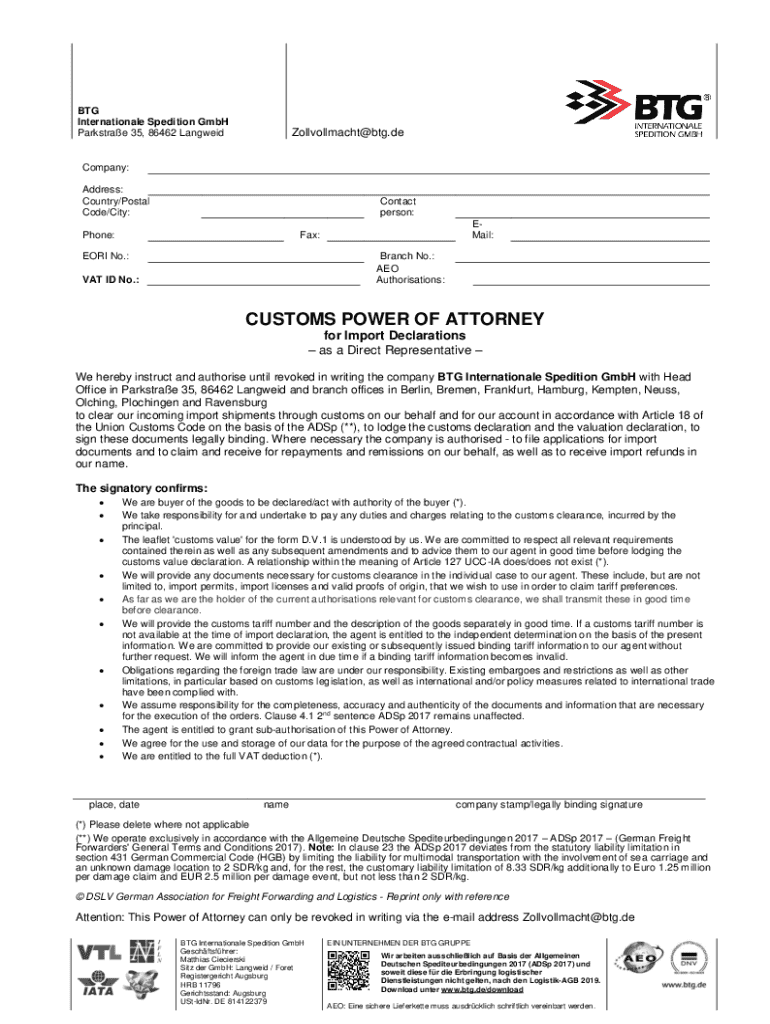 Prostrate 35, 86462 LangweidZollvollmacht@btg.deCompany: