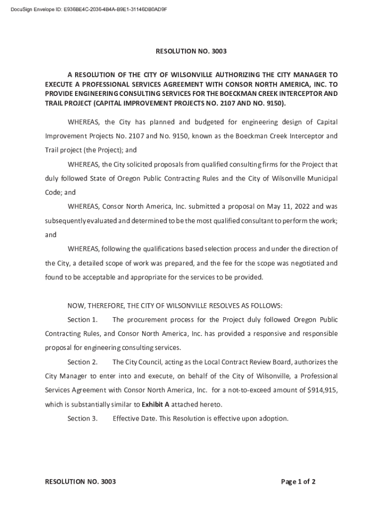 RESOLUTION NO. 3003 A RESOLUTION OF THE CITY OF WILSONVILLE AUTHORIZING THE CITY MANAGER TO EXECUTE A PROFESSIONAL SERVICES AGREEMENT WITH CONSORT NORTH AMERICA, INC. TO PROVIDE ENGINEERING CONSULTING