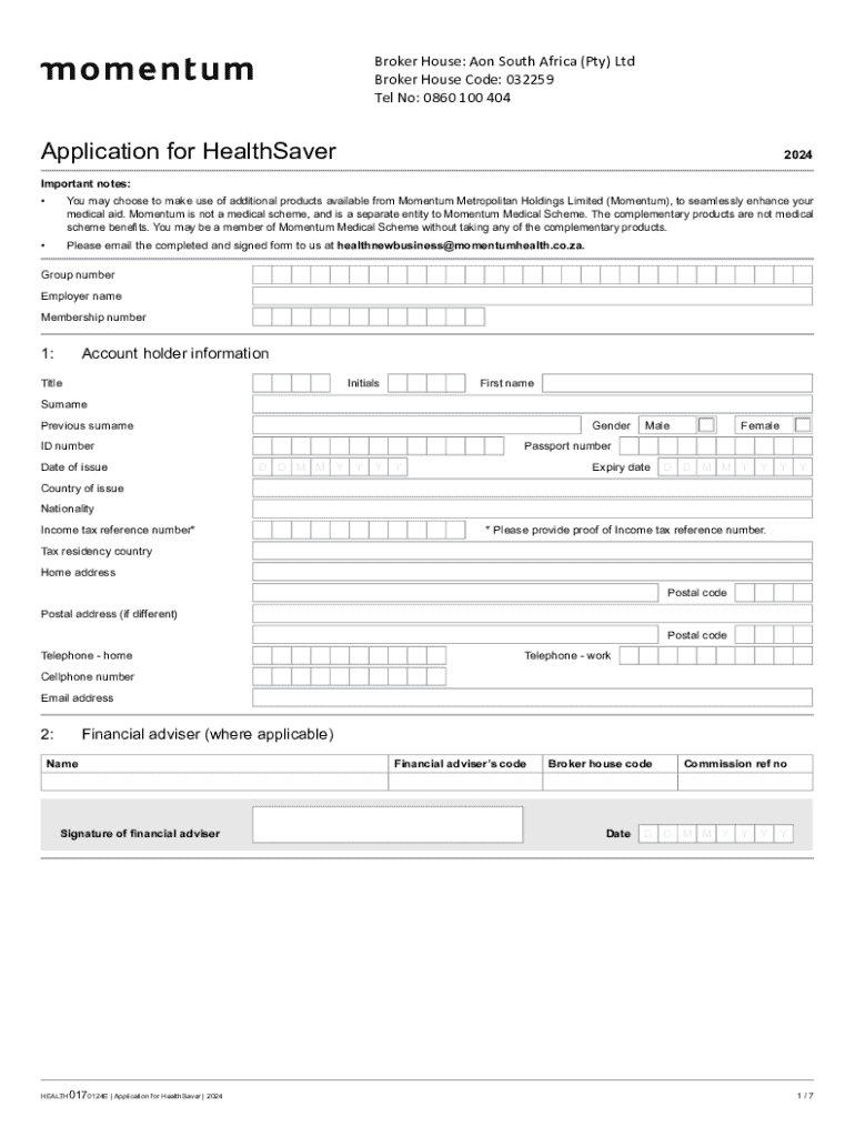 Broker House: Aon South Africa (Pty) Ltd Broker House Code: 032259 Tel No: 0860 100 404Application for HealthSaver2024Important notes: You may choose to make use of additional products available from