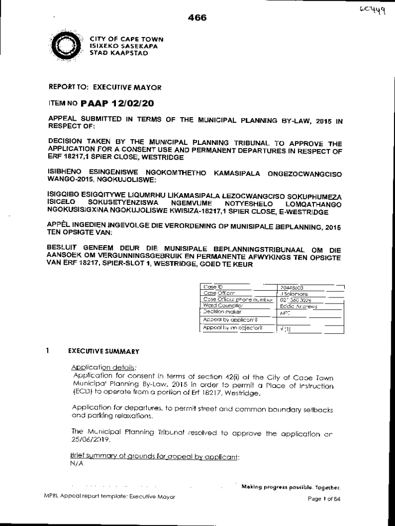 466PAAP 12/02/20467Brief summary of grounds for appeal by an objector: The appeal is submitted by R Thomas of ERF 18218, 54, Bonsai Way, West ridge against the decision taken by the Municipal Planning