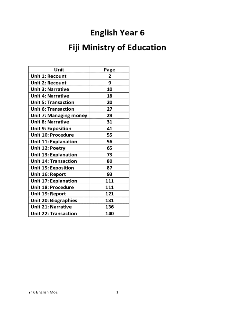 English Year 6 Fiji Ministry of Education Unit 1: Recount Unit 2: Recount Unit 3: Narrative Unit 4: Narrative Unit 5: Transaction Unit 6: Transaction Unit 7: Managing money Unit 8: Narrative Unit