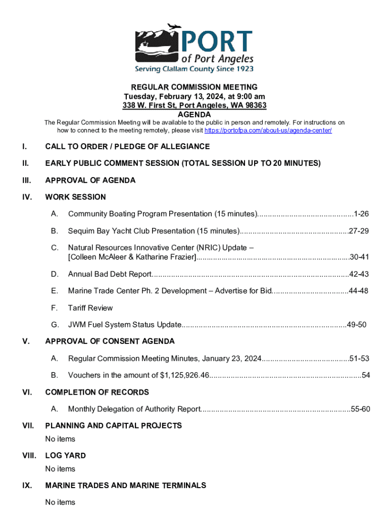 REGULAR COMMISSION MEETING Tuesday, February 13, 2024, at 9:00 am 338 W. First St, Port Angeles, WA 98363 Agenda Regular Commission Meeting will be available to the public in person and remotely.