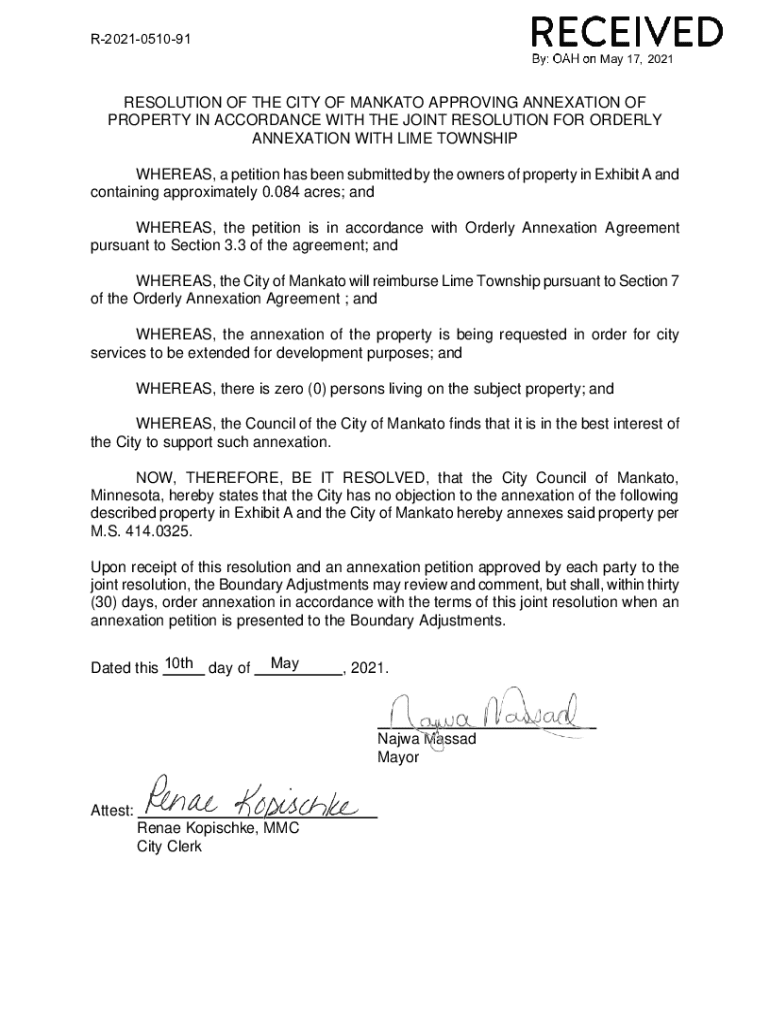 R2021051091 May 17, 2021RESOLUTION OF THE CITY OF MANKATO APPROVING ANNEXATION OF PROPERTY IN ACCORDANCE WITH THE JOINT RESOLUTION FOR ORDERLY ANNEXATION WITH LIME TOWNSHIP WHEREAS, a petition has