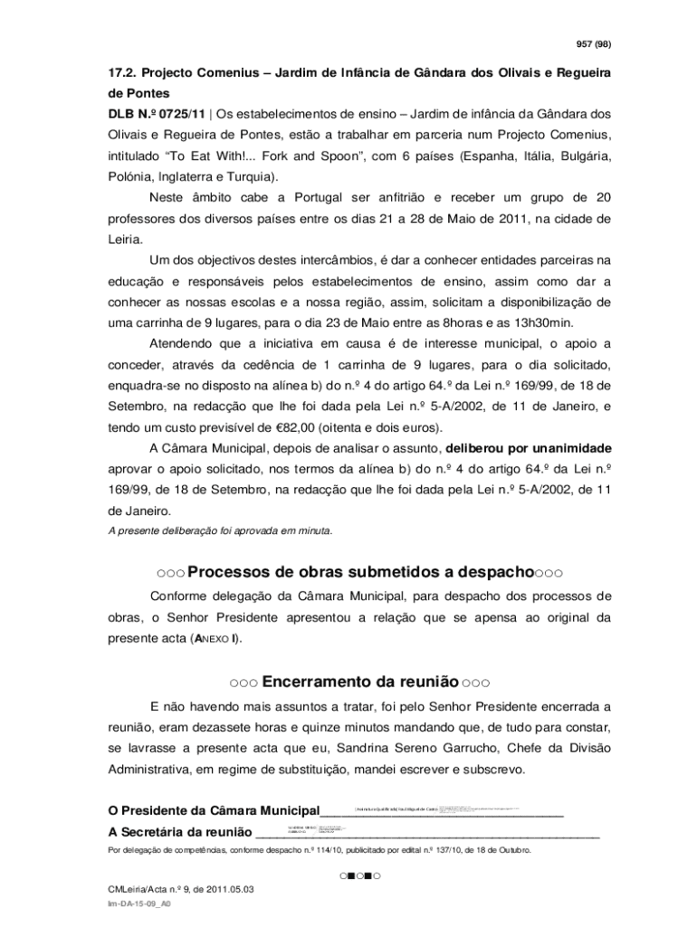 860 (1)Acta n. 9/2011Aos trs dias do ms de Maio do ano de dois mil e onze, no Edifciosede do Municpio de Leiria, sito no Largo da Repblica desta cidade, reuniu ordinariamente a Cmara Municipal de