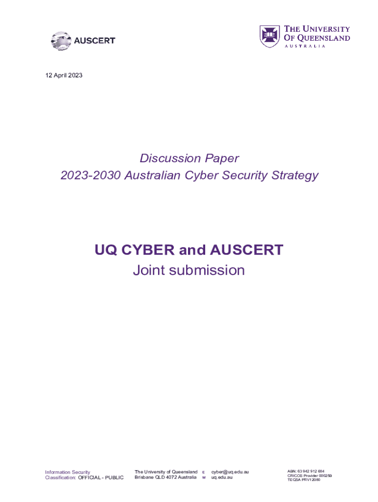 12 April 2023Discussion Paper 20232030 Australian Cyber Security StrategyUQ CYBER and AUSCERT Joint submissionInformation Security Classification: OFFICIAL PUBLICThe University of Queensland Brisbane