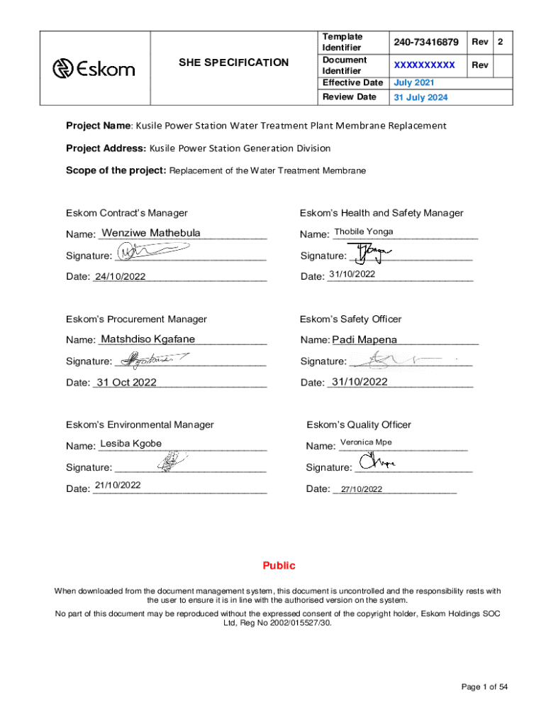 SHE SPECIFICATIONTemplate Identifier Document Identifier Effective Date Review Date24073416879RevXXXXXXXXXXRev2July 2021 31 July 2024Project Name: Muscle Power Station Water Treatment Plant Membrane