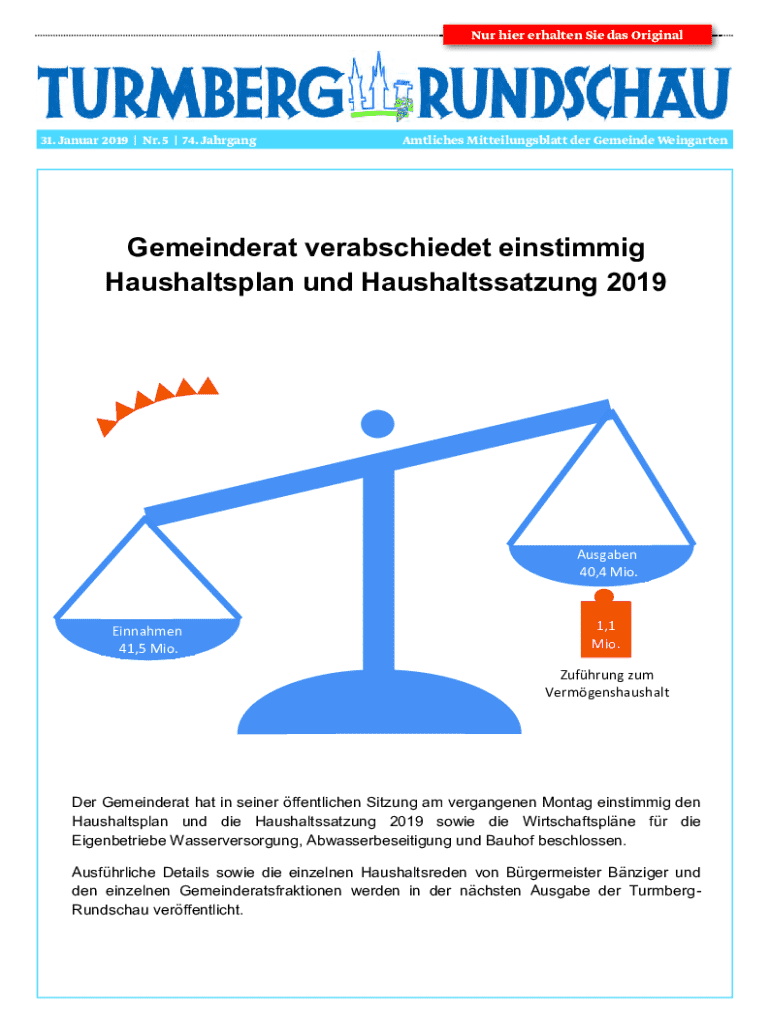 Beilage31. January 2019 | NR. 5 | 74. JahrgangAmtliches Mitteilungsblatt her Demand WeingartenGemeinderat verabschiedet einstimmig