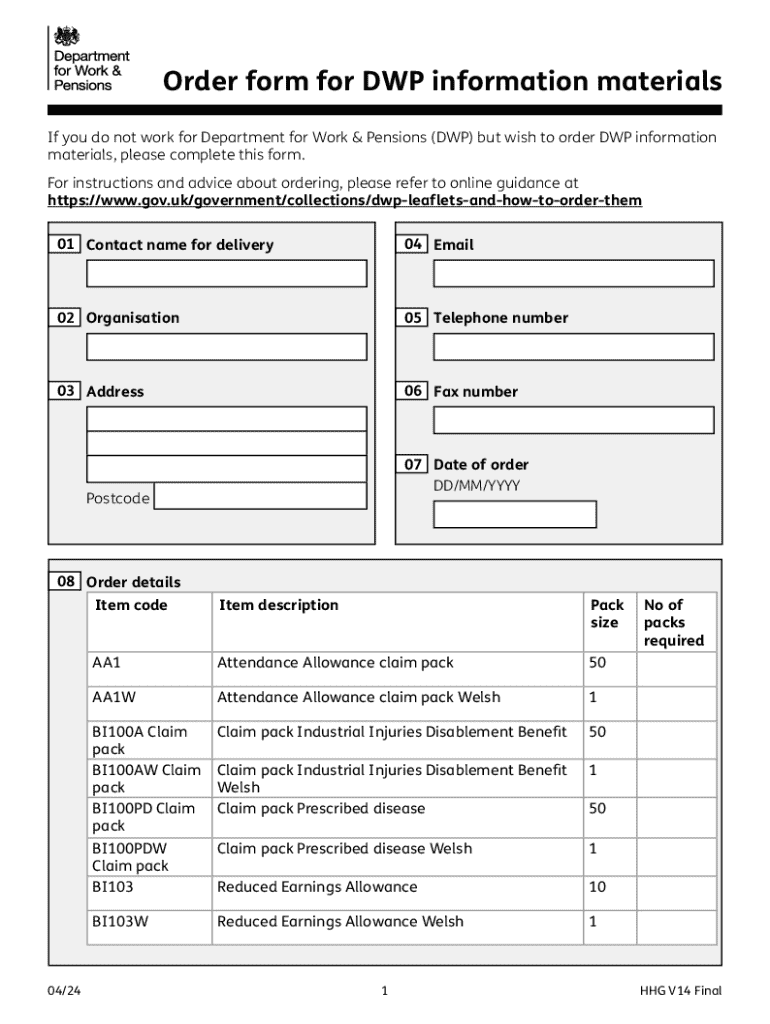 Order form for DWP information materials If you do not work for Department for Work & Pensions (DWP) but wish to order DWP information materials, please complete this form. For instructions and advice