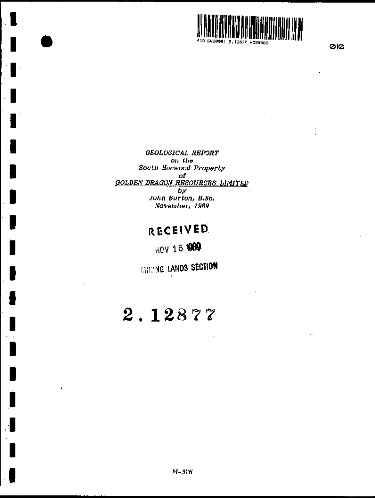 41016NE0001 2 .12877 HORWOOD010GEOLOGICAL REPORT on the South Norwood Property of GOLDEN DRAGON RESOURCES LIMITED by John Burton, B. Se. November, 1989RECEIVED KO 15 Ill\'.NG UFOs SECTION2.12877M326l