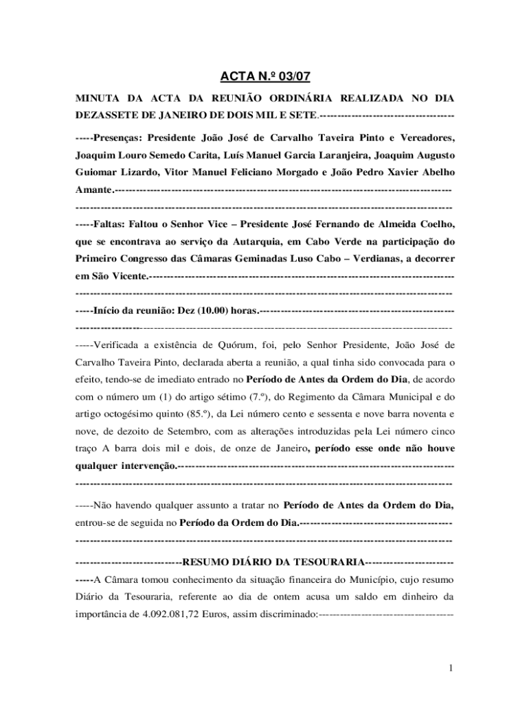 ACTA N. 03/07 MINUTE DA ACTA DA REUNION ORD INRIA REALIZED NO DID DEVASTATE DE JANEIRO DE DOES MIL E SET. Presenas: President Jew Jo's de Carvalho Tamara Pinto e Paradoxes, Joaquim Douro Seed Carina,