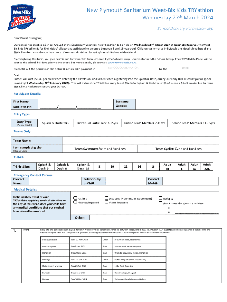 New Plymouth Sanitarium Weetabix Kids Triathlon Wednesday 27th March 2024 School Delivery Permission Slip Dear Parent/Caregiver, Our school has created a School Group for the Sanitarium Weetabix Kids