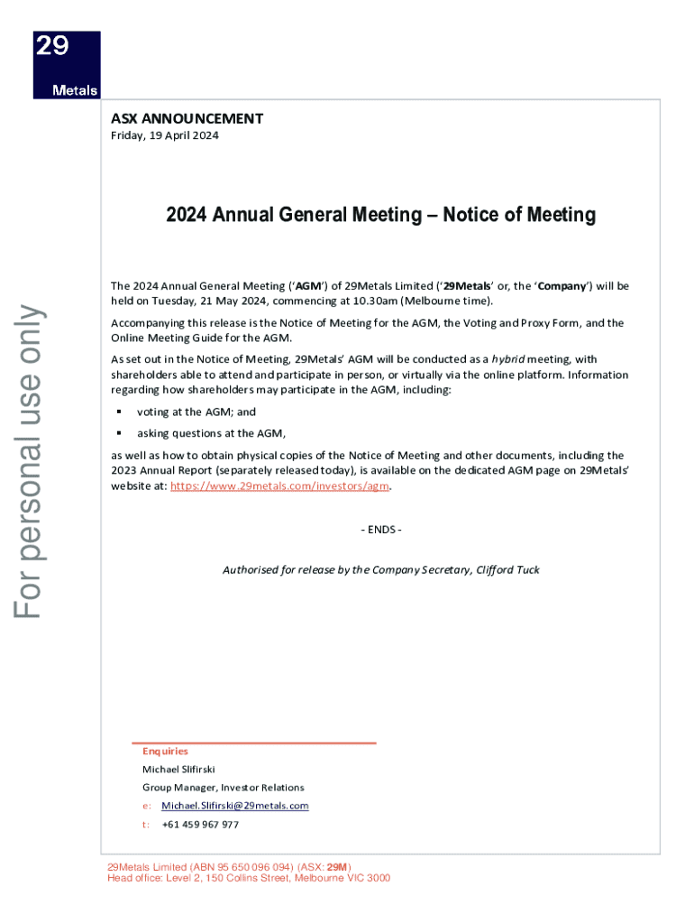 ASX ANNOUNCEMENT Friday, 19 April 2024For personal use only2024 Annual General Meeting Notice of MeetingThe 2024 Annual General Meeting (AGM) of 29Metals Limited (29Metals or, the Company) will be