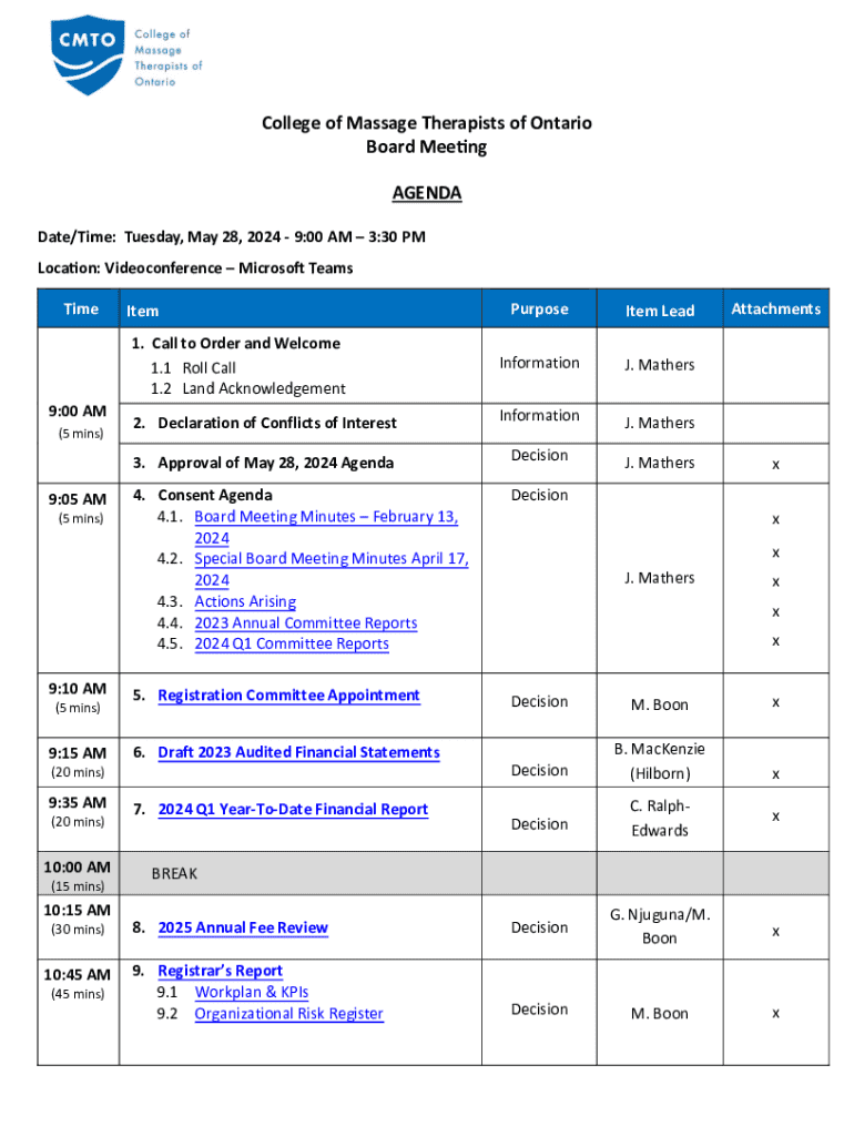 College of Massage Therapists of Ontario Board Meeting AGENDA Date/Time: Tuesday, May 28, 2024 9:00 AM 3:30 PM Location: Videoconference Microsoft Teams Time9:00 AM (5 mins)9:05 AM (5 mins)9:10 AM