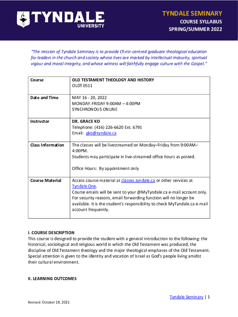 TYNDALE SEMINARY COURSE SYLLABUS SPRING/SUMMER 2022The mission of Tyndale Seminary is to provide Christcentred graduate theological education for leaders in the church and society whose lives are