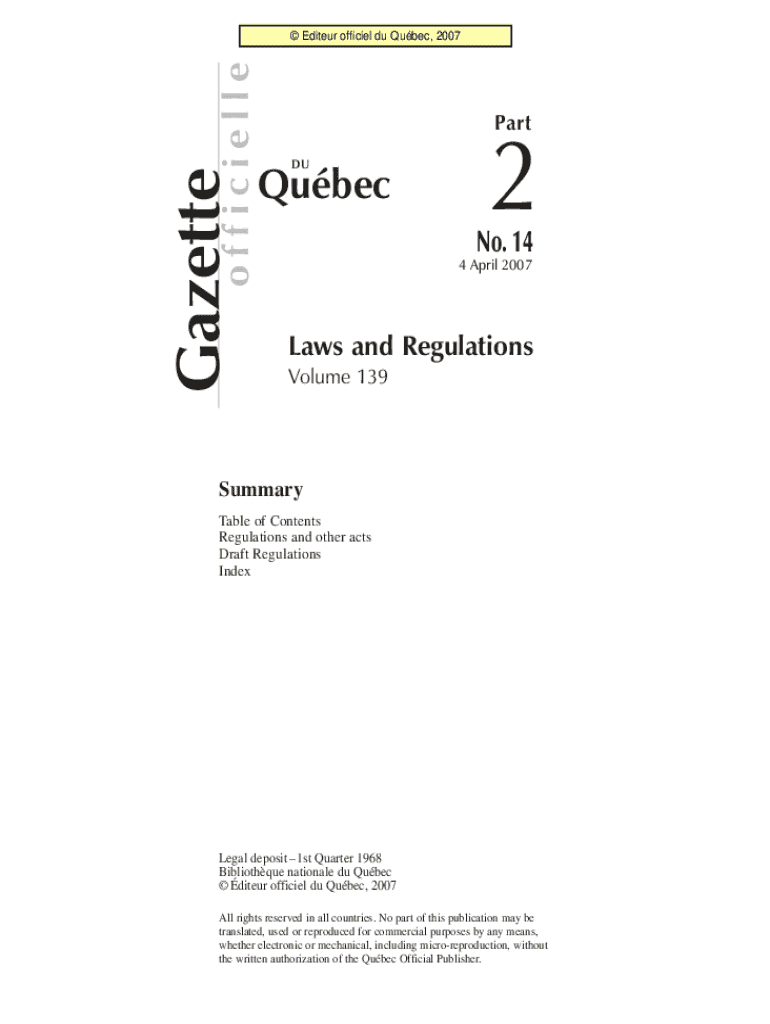 Gazette officially Edited official Du Quebec, 2007PartDUQubec2No. 144 April 2007Laws and Regulations Volume 139Summary Table of Contents Regulations and other acts Draft Regulations Indexical deposit