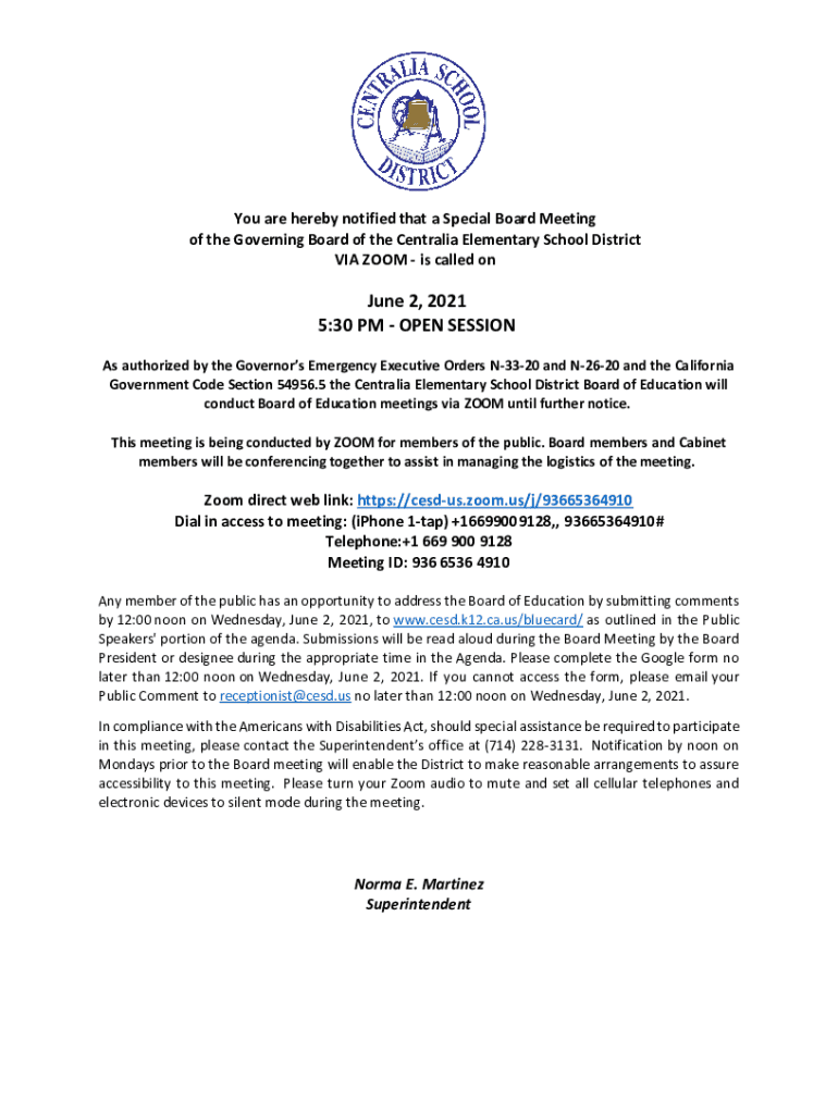 You are hereby notified that a Special Board Meeting of the Governing Board of the Central Elementary School District VIA ZOOM is called on June 2, 2021 5:30 PM OPEN SESSION As authorized by the Governors
