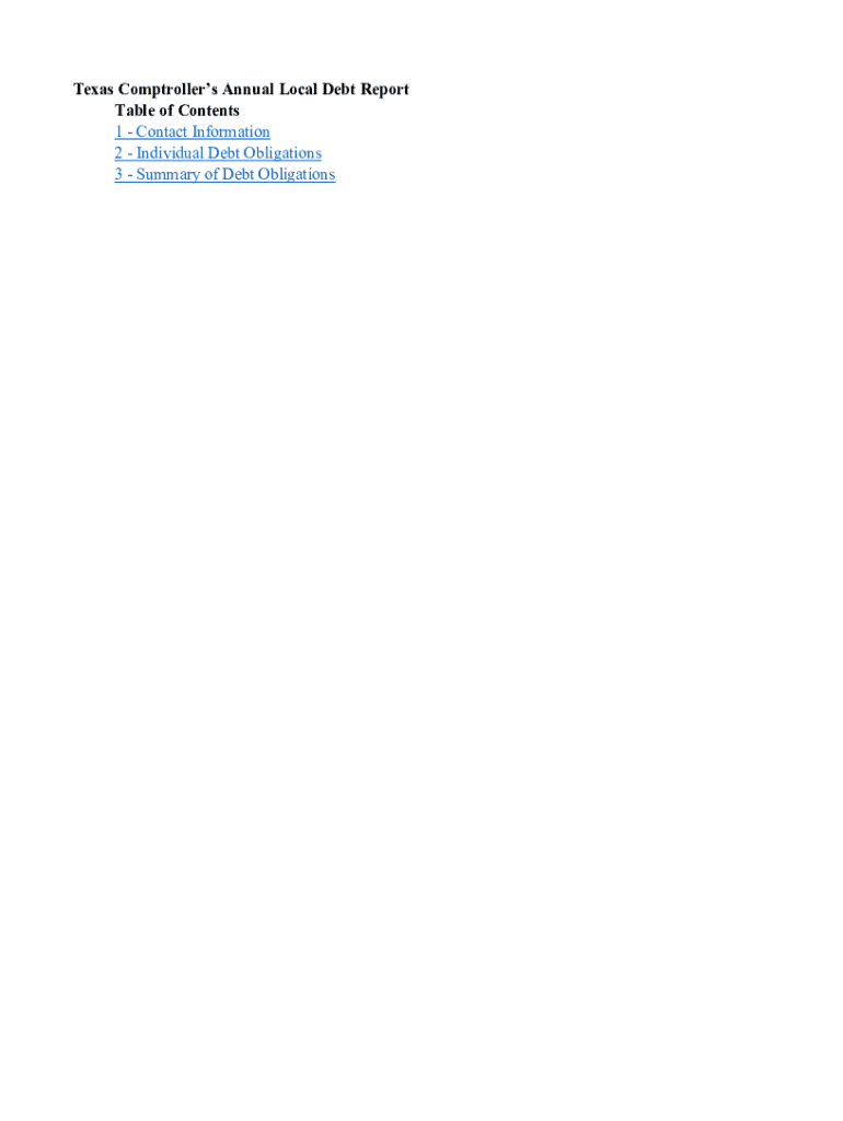 Texas Comptrollers Annual Local Debt Report Table of Contents 1 Contact Information 2 Individual Debt Obligations 3 Summary of Debt Obligations Texas Comptrollers Annual Local Debt Report Fill in