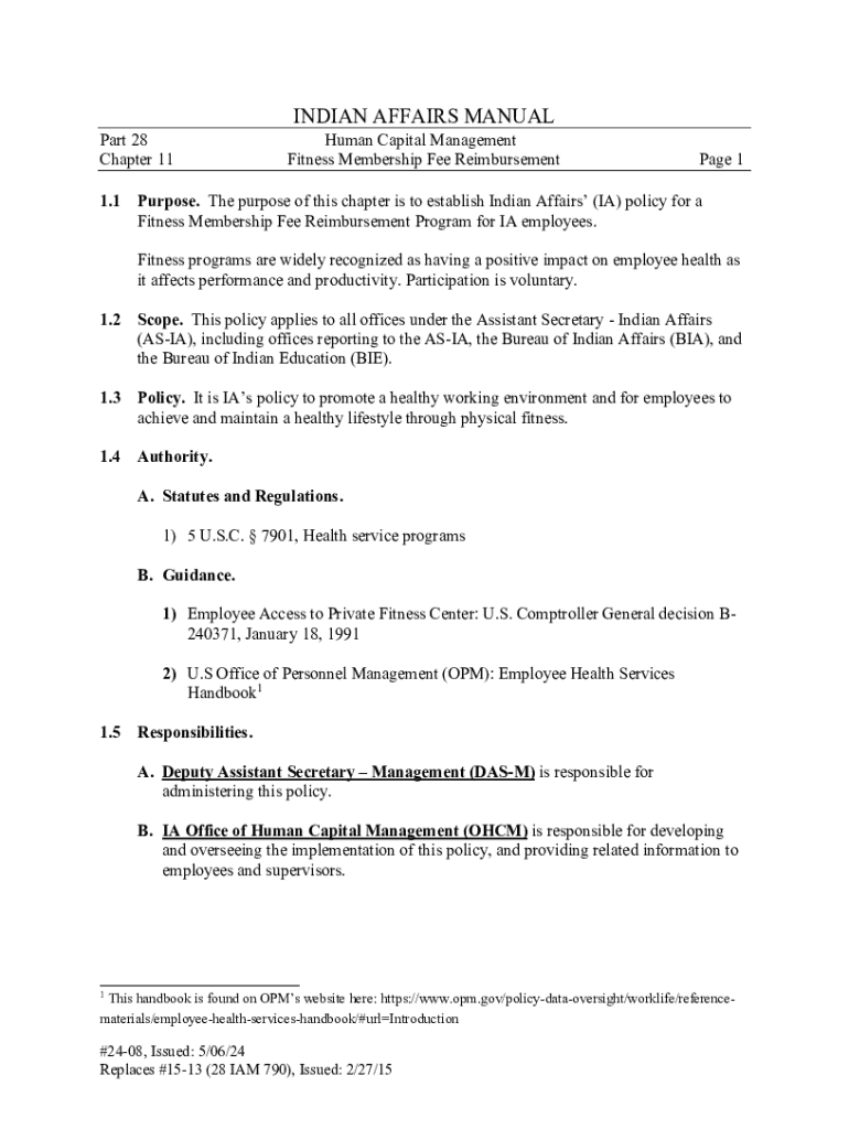 Part 28 Chapter 11 1.1INDIAN AFFAIRS MANUALHuman Capital Management Fitness Membership Fee ReimbursementPage 1Purpose. The purpose of this chapter is to establish Indian Affairs (IA) policy for a