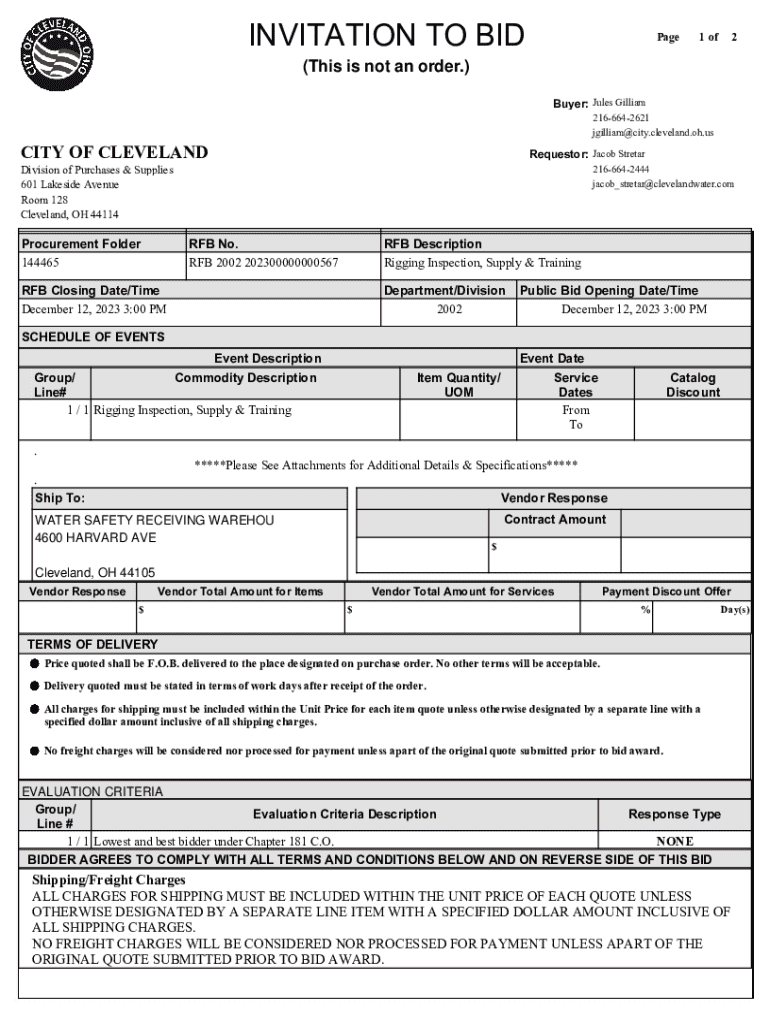 INVITATION TO BIDPage1 of2(This is not an order.) Buyer: Jules Gilliam 2166642621 jgilliam@city.cleveland.oh.usCITY OF CLEVELANDRequestor: Jacob Stream 2166642444 jacob_stretar@clevelandwater.comDivision