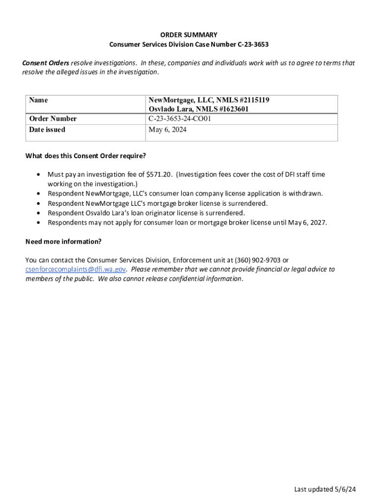 ORDER SUMMARY Consumer Services Division Case Number C233653 Consent Orders resolve investigations. In these, companies and individuals work with us to agree to terms that resolve the alleged issues