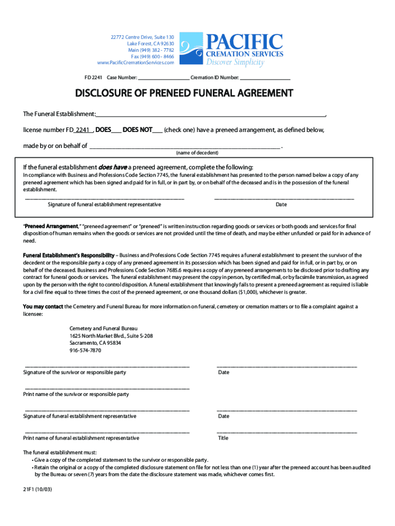 22772 Center Drive, Suite 130 Lake Forest, CA 92630 Main (949) 382 7782 Fax (949) 600 8466 www.PacificCremationServices.com FD 2241 Case Number:Cremation ID Number:DISCLOSURE OF PRINTED FUNERAL AGREEMENT