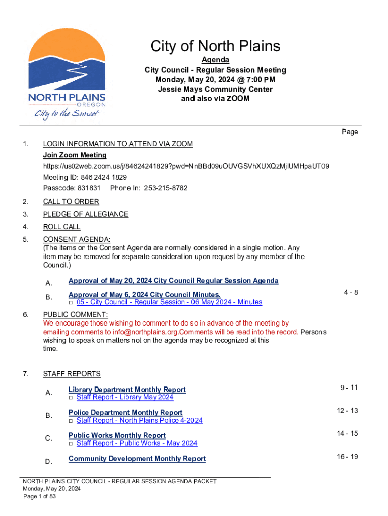City of North PlainsAgenda City Council Regular Session Meeting Monday, May 20, 2024 @ 7:00 PM Jessie Mays Community Center and also via ZOOMPage 1.LOGIN INFORMATION TO ATTEND VIA ZOOM Join Zoom Meeting