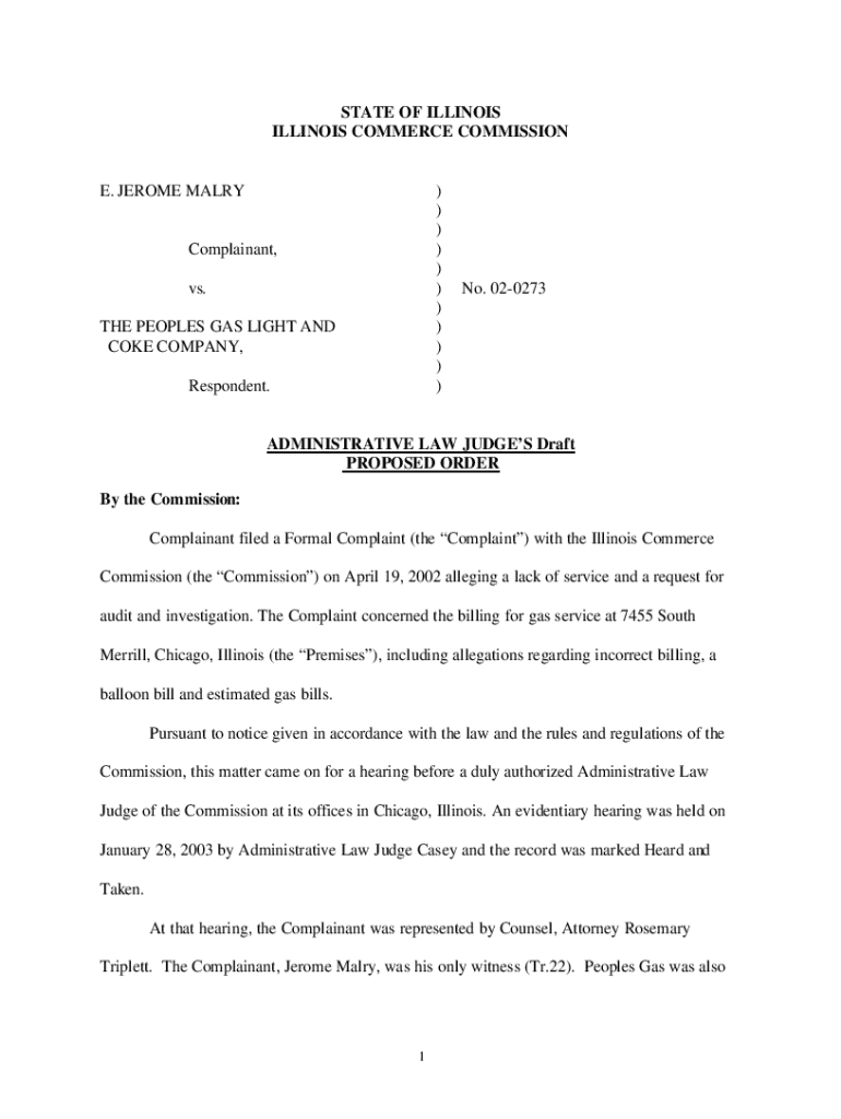 STATE OF ILLINOIS COMMERCE COMMISSION. JEROME MARY)) )) )) )) )) )Complainant, vs. THE PEOPLES GASlight AND COKE COMPANY, Respondent. No. 020273ADMINISTRATIVE LAW JUDGES Draft PROPOSED ORDER By the