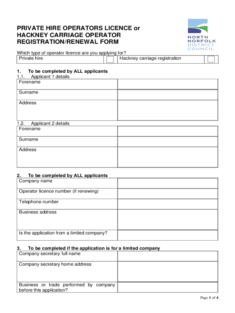 PRIVATE HIRE OPERATORS License or HACKNEY CARRIAGE OPERATOR REGISTRATION/RENEWAL FORM Which type of operator license are you applying for? Private hire Hackney carriage registration 1. To be completed