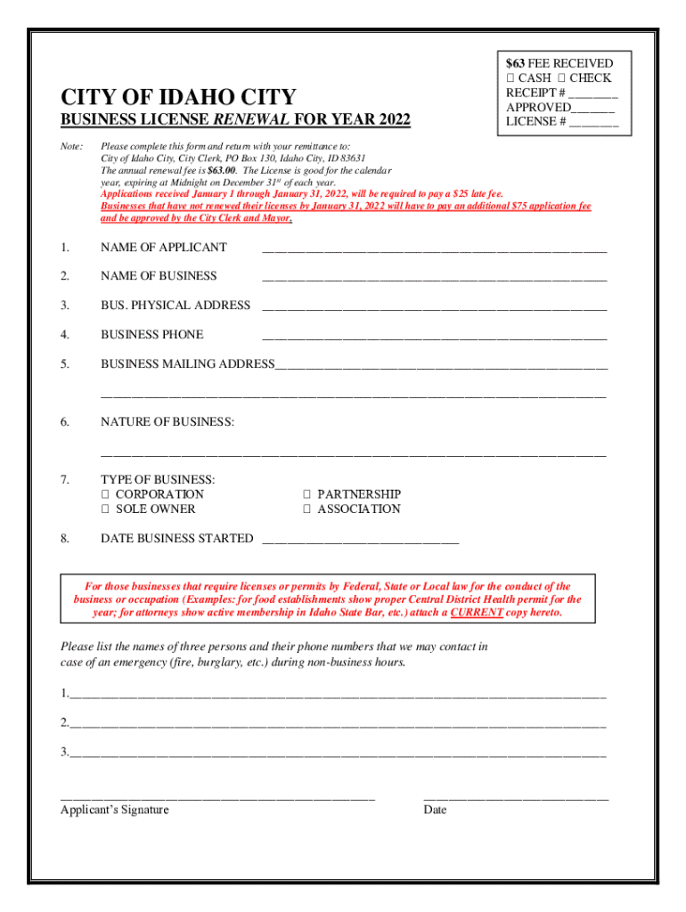 $63 FEE RECEIVED CASH CHECK RECEIPT # ___ APPROVED___ LICENSE # ___CITY OF IDAHO CITY BUSINESS LICENSE RENEWAL FOR YEAR 2022 Note:Please complete this form and return with your remittance to: City