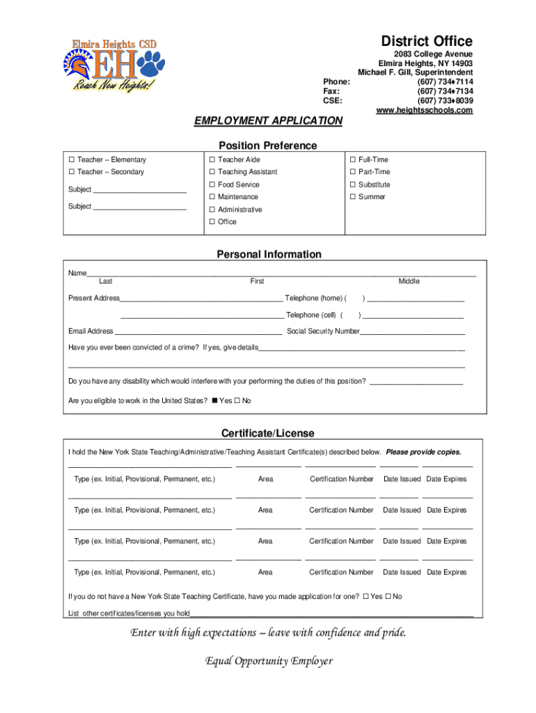 District Office 2083 College Avenue Elmira Heights, NY 14903 Michael F. Gill, Superintendent Phone: (607) 7347114 Fax: (607) 7347134 CSE: (607) 7338039 www.heightsschools.comEMPLOYMENT APPLICATION