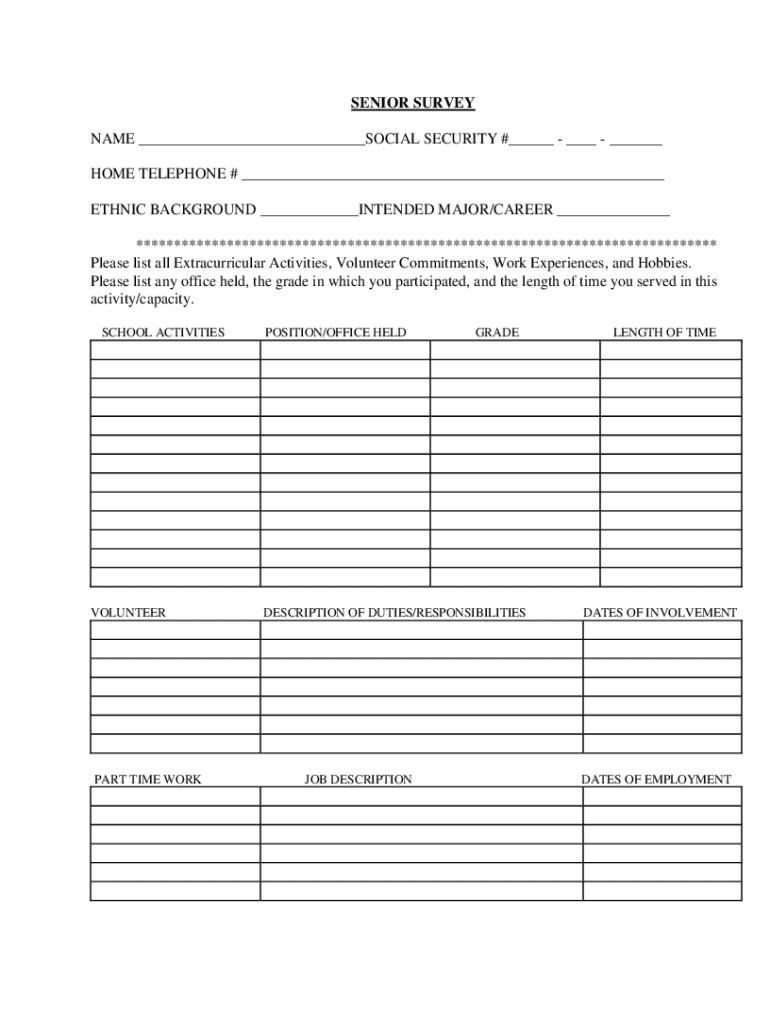 SENIOR SURVEY NAME ___SOCIAL SECURITY #___ ___ ___ HOME TELEPHONE # ___ ETHNIC BACKGROUND ___INTENDED MAJOR/CAREER ___ *****************************************************************************