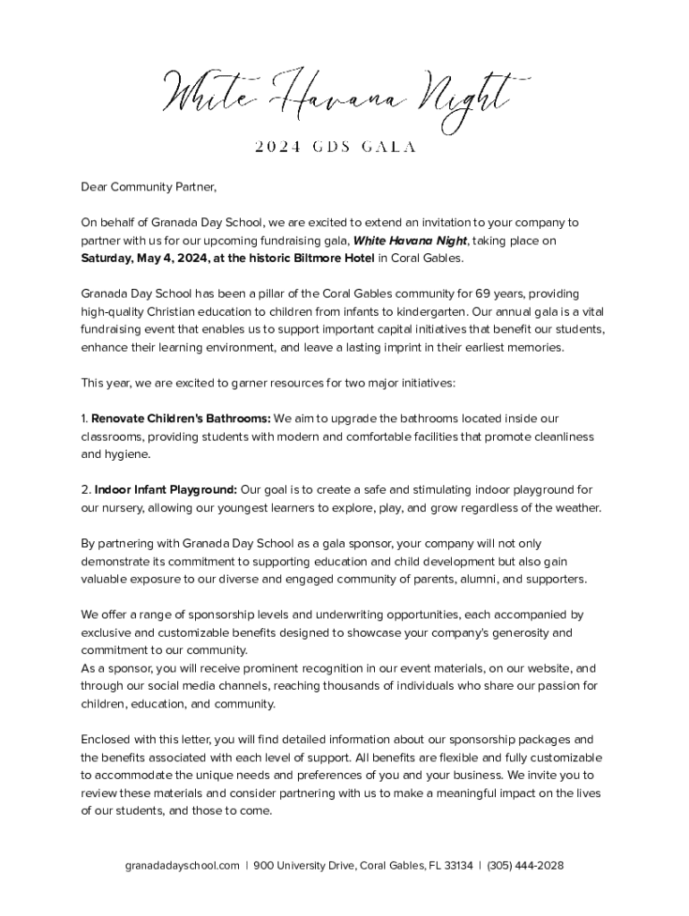 Dear Community Partner, On behalf of Granada Day School, we are excited to extend an invitation to your company to partner with us for our upcoming fundraising gala, White Havana Night, taking place