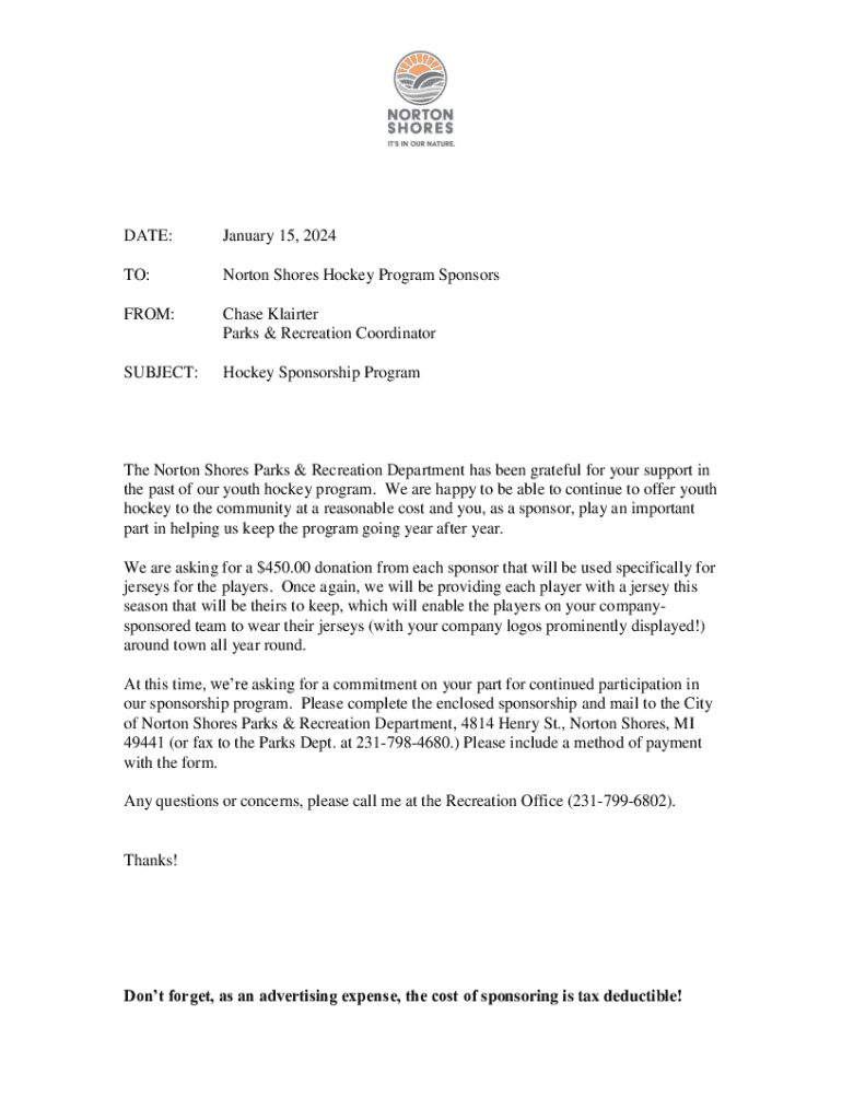 DATE:January 15, 2024TO:Norton Shores Hockey Program SponsorsFROM:Chase Clearer Parks & Recreation CoordinatorSUBJECT:Hockey Sponsorship Program Norton Shores Parks & Recreation Department has been
