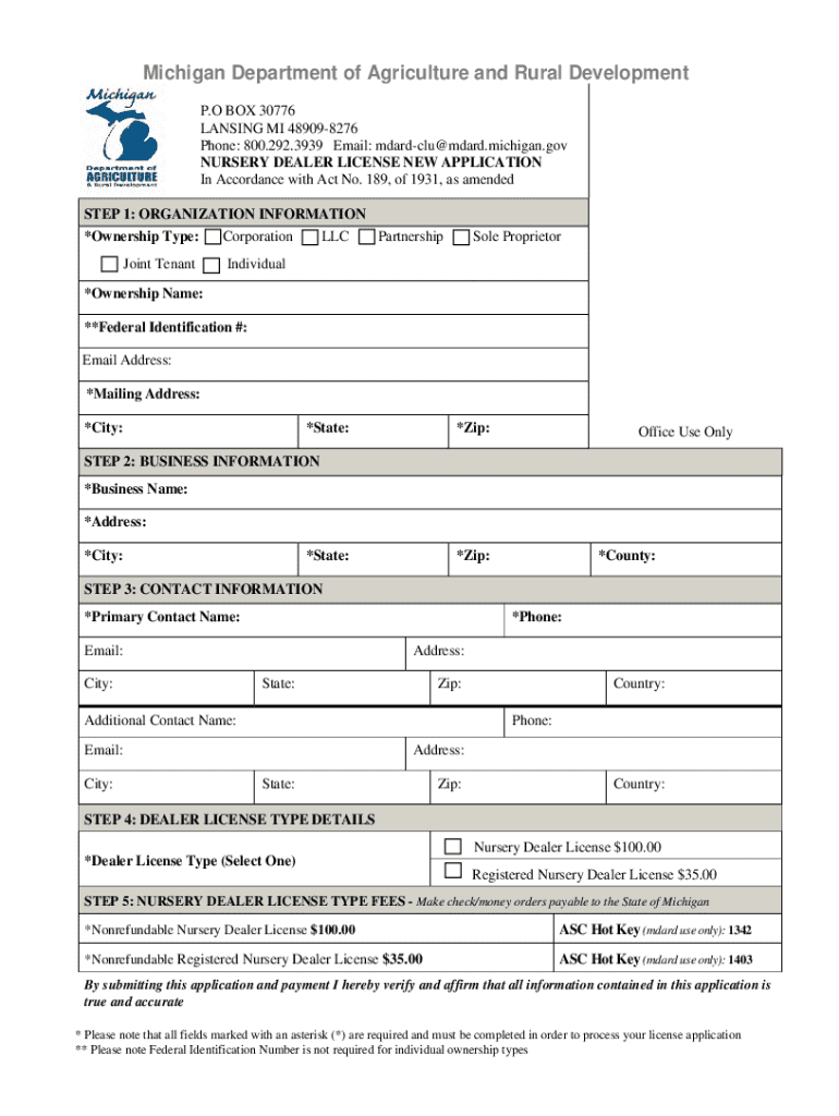 Michigan Department of Agriculture and Rural Development P. O BOX 30776 LANSING MI 489098276 Phone: 800.292.3939 Email: mdardclu@mdard.michigan.gov NURSERY DEALER LICENSE NEW APPLICATION In Accordance