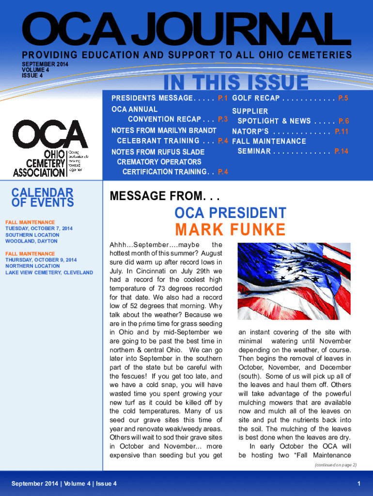 OCT JOURNAL PROVIDING EDUCATION AND SUPPORT TO ALL OHIO CEMETERIES SEPTEMBER 2014 VOLUME 4 ISSUE 4IN THIS ISSUEPRESIDENTS MESSAGE. . . . . . P.1 OCT ANNUALCONVENTION RECAP. . . . P.3 NOTES FROM MARILYN