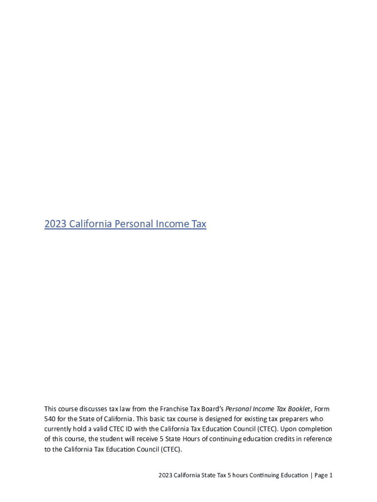 2023 California Personal Income TaxThis course discusses tax law from the Franchise Tax Boards Personal Income Tax Booklet, Form 540 for the State of California. This basic tax course is designed