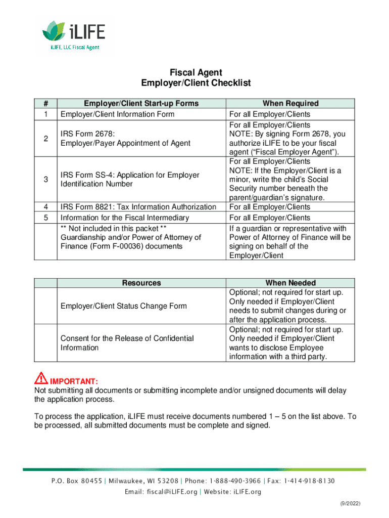 Fiscal Agent Employer/Client Checklist # 1Employer/Client Startup Forms Employer/Client Information Form2IRS Form 2678: Employer/Payer Appointment of Agent3IRS Form SS4: Application for Employer Identification