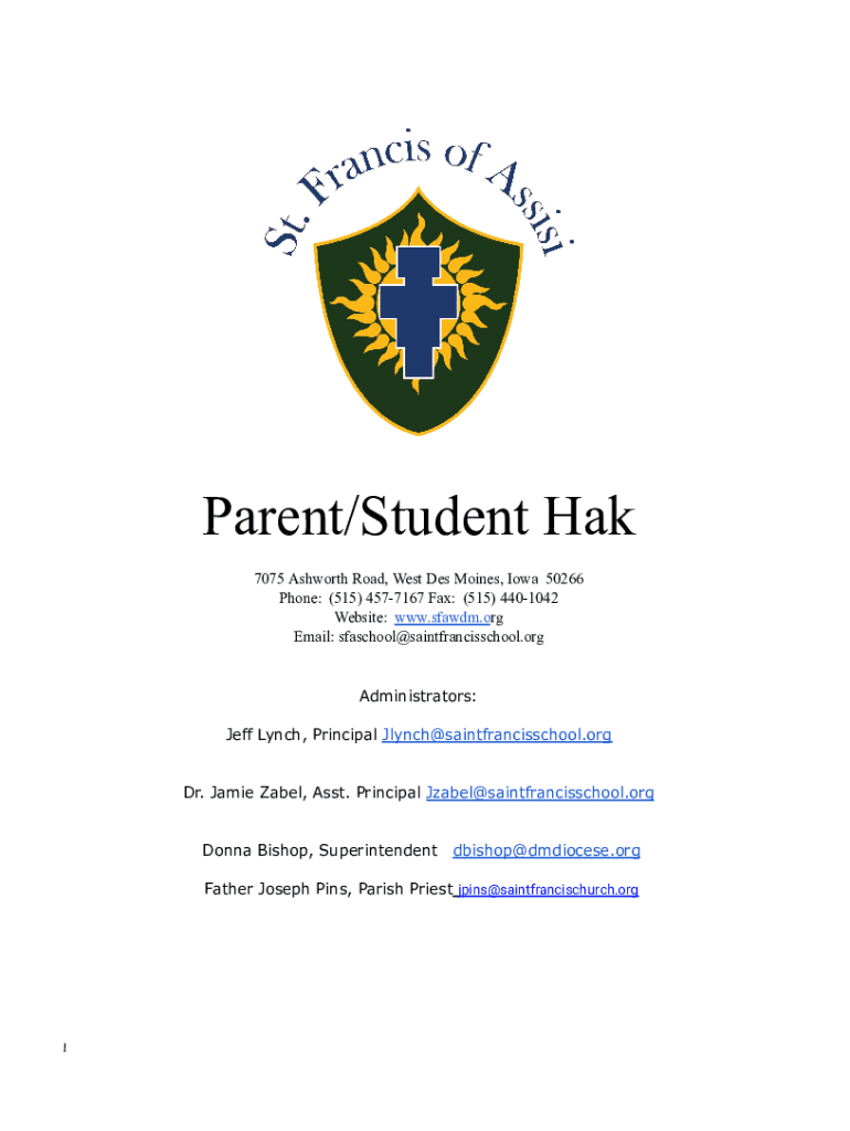 Parent/Student Had 7075 Ashworth Road, West Des Moines, Iowa 50266 Phone: (515) 4577167 Fax: (515) 4401042 Website: www.sfawdm.org Email: sfaschool@saintfrancisschool.orgAdministrators: Jeff Lynch,