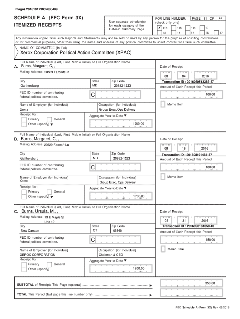 Image# 201610179032886489SCHEDULE A (FEC Form 3X) ITEMIZED RECEPTOR LINE NUMBER: (check only one)Use separate schedule(s) for each category of the Detailed Summary Page 11a 13PAGE11 OF11b11c121415164717Any
