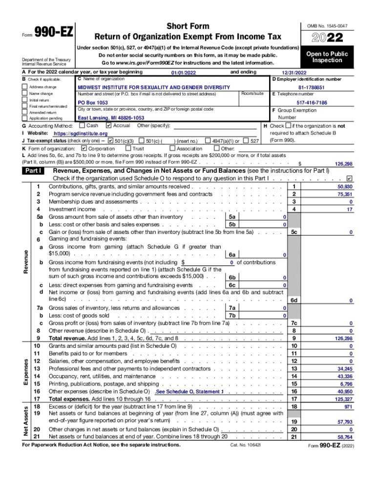 Form990EZDepartment of the Treasury Internal Revenue Service Short Form Return of Organization Exempt From Income Tax Under section 501(c), 527, or 4947(a)(1) of the Internal Revenue Code (except