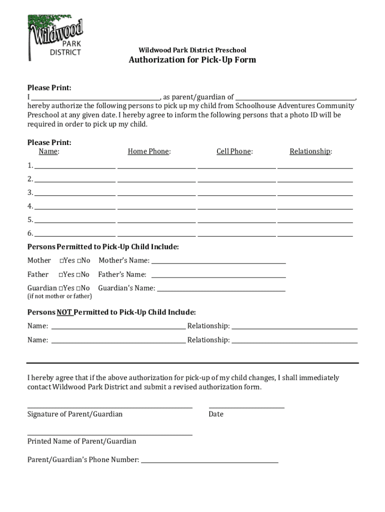 Wildwood Park District PreschoolAuthorization for PickUp FormPlease Print:I ___, as parent/guardian of ___,hereby authorize the following persons to pick up my child from Schoolhouse Adventures CommunityPreschool