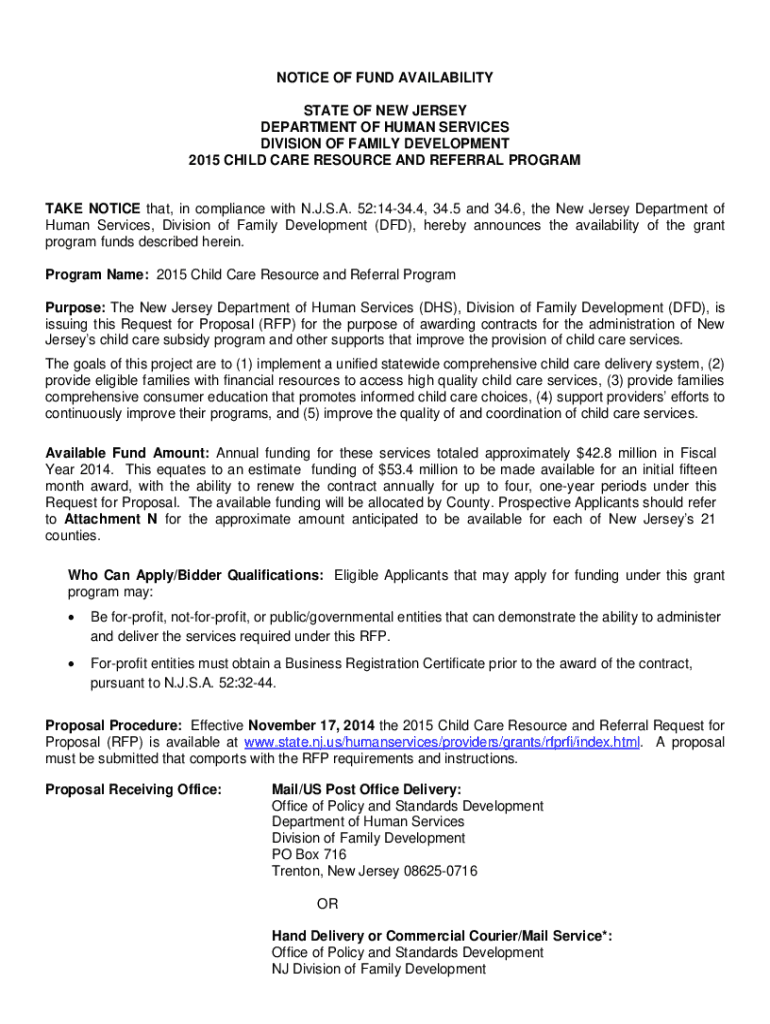 NOTICE OF FUND AVAILABILITY STATE OF NEW JERSEY DEPARTMENT OF HUMAN SERVICES DIVISION OF FAMILY DEVELOPMENT 2015 CHILD CARE RESOURCE AND REFERRAL PROGRAMMABLE NOTICE that, in compliance with N.J.S.A.