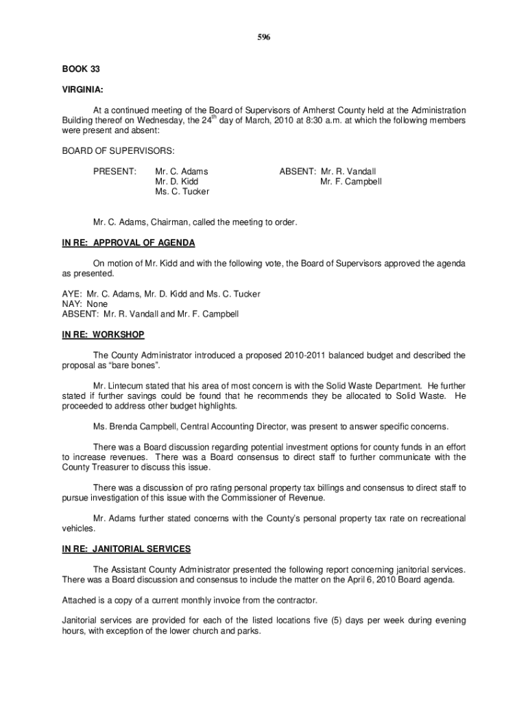 596BOOK 33 VIRGINIA: At a continued meeting of the Board of Supervisors of Amherst County held at the Administration TH Building thereof on Wednesday, the 24 day of March 2010 at 8:30 a.m. at which