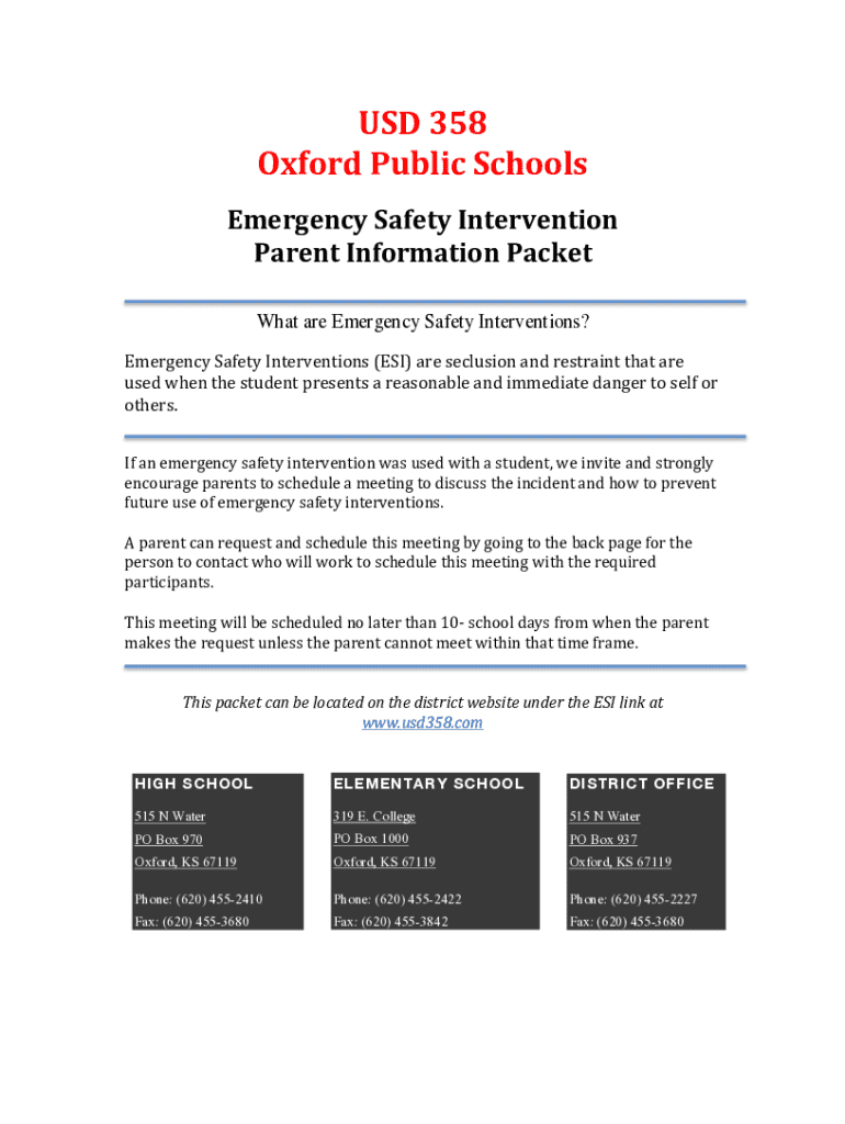 USD 358Oxford Public SchoolsEmergency Safety InterventionParent Information PacketWhat are Emergency Safety Interventions? Emergency Safety Interventions (ESI) are seclusion and restraint that reused
