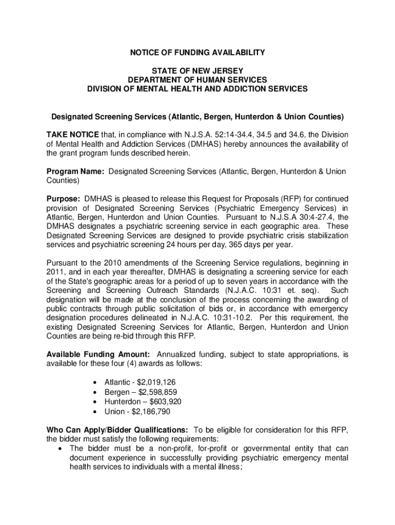 NOTICE OF FUNDING AVAILABILITY STATE OF NEW JERSEY DEPARTMENT OF HUMAN SERVICES DIVISION OF MENTAL HEALTH AND ADDICTION SERVICESDesignated Screening Services (Atlantic, Bergen, Hunter don & Union