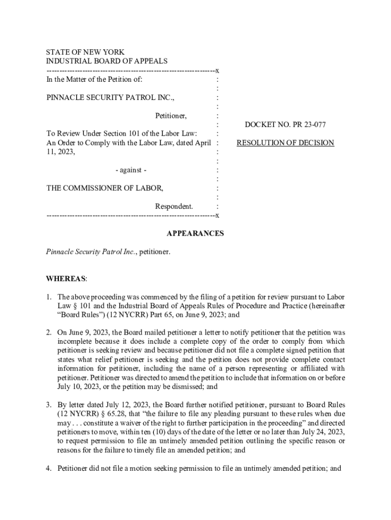 STATE OF NEW YORK INDUSTRIAL BOARD OF APPEALS x In the Matter of the Petition of: : : PINNACLE SECURITY PATROL INC., : : Petitioner, : : To Review Under Section 101 of the Labor Law: : An Order to