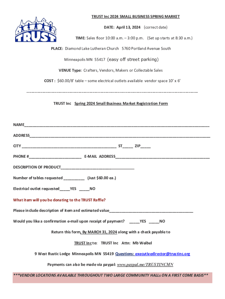 TRUST Inc 2024 SMALL BUSINESS SPRING MARKET DATE: April 13, 2024 (correct date) TIME: Sales floor 10:00 a.m. 3:00 p.m. (Set up starts at 8:30 a.m.) PLACE: Diamond Lake Lutheran Church 5760 Portland