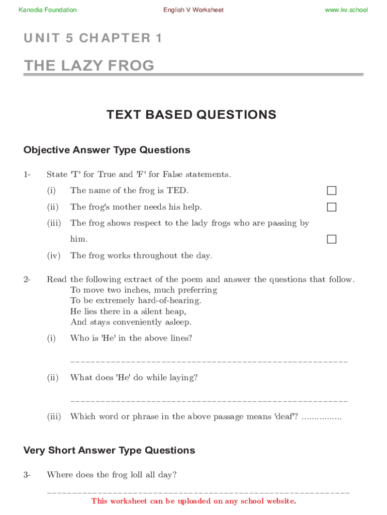 Anoxia Foundation English V Worksheet Page 54UNIT 5 CHAPTER 1The Lazy Frog.KV.school UNIT 5 Chapter 1THE LAZY FROG TEXT BASED QUESTIONS Objective Answer Type Questions 1State \'T\' for True and \'F\'