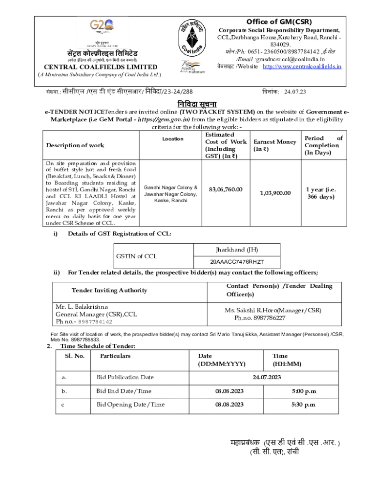 Office of GM(CSR) Corporate Social Responsibility Department, CCL, Darbhanga House, Kutchery Road, Ranchi 834029. /pH: 0651 2360500/8987784142, /Email :gmsdncsr.ccl@coalindia.in /Website http://www.centralcoalfields.in