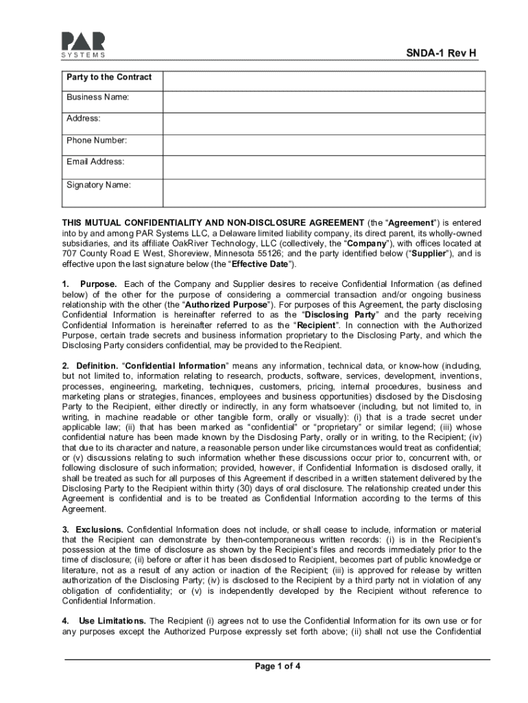 SNDA1 Rev H Party to the Contract Business Name: Address: Phone Number: Email Address: Signatory Name:THIS MUTUAL CONFIDENTIALITY AND NONDISCLOSURE AGREEMENT (the Agreement) is entered into by and